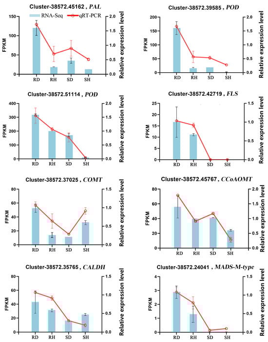 To validate the accuracy and repeatability of the transcriptomic analysis in the present research, qRT-PCR was conducted on a set of DEGs associated with phenylpropanoid metabolism. Among all the candidate DEGs related to phenylpropanoid biosynthesis, eight DEGs with higher expression levels in ‘Sorbonne’ than ‘Tresor’ after infection with B. elliptica were selected for qRT-PCR analysis. Figure 7 shows the expression levels of all the selected DEGs determined using qRT-PCR and RNA-Seq. On the whole, the expression patterns of the eight DEGs, as determined using qRT-PCR, were consistent with the corresponding FPKM values obtained using the RNA-Seq data. The critical genes for phenylpropanoid biosynthesis, i.e., phenylalanine ammonia-lyase (PAL), peroxidase (POD), flavonol synthase (FLS), caffeic acid 3-O-methyltransferase (COMT), caffeoyl-CoA O-methyltransferase (CCoAOMT), coniferyl-aldehyde dehydrogenase (CALDH), and MADS-M-type, were more highly expressed in ‘Sorbonne’ than in ‘Tresor’ after infection with B. elliptica. The majority of genes exhibited a similar expression profile using both methods. This result supported the reliability of the RNA-seq data.