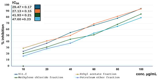 Based on the previous activity results, the most promising cake was selected for further biological and phytochemical investigation. As lettuce methanolic extract showed dual activity, and due to the scarcity of previous work on this seed and its waste, it was a valuable candidate for further phytochemical and biological investigations. Lettuce seed cake methanolic extract was subjected to fractionation, which afforded petroleum ether, methylene chloride, and ethyl acetate fractions. Ethyl acetate fraction showed the highest antioxidant activity, followed by the methylene chloride fraction with IC50 27.13 ± 0.15 and 41.93 ± 0.21, respectively, compared to standard ascorbic acid 29.47 ± 0.17 (Figure 1). Moreover, methylene chloride and ethyl acetate fractions showed promising antimicrobial inhibition activity against the tested microorganisms with comparison with antibacterial ampicillin and antifungal clotrimazole standards (Table S1). The comparison with the standard revealed that the highest activity in terms of percent activity index was observed for the methylene chloride fraction against S. aureus (81.6), followed by C. albicans (65.4), and E. coli (36.26) (Table S1).
