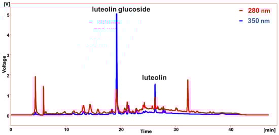 Using reversed-phase HPLC fitted with a diode array detector, the relevant extract was fractionated to determine the phytochemical components of lettuce seed cake extract that are in charge of the antioxidant and antibacterial actions. It was observed that luteolin glucoside represents the major compound (Figure 2). This could be easily deduced by comparing the retention time and UV spectrum of standard luteolin glucoside (Figure S2). In addition, the less polar compound that was eluted at Rt 26 mint has the same UV spectrum as luteolin glucoside (Figure S2). This compound was tentatively identified as an aglycon part of luteolin glucoside, e.g., luteolin. However, reliable identification of these compounds requires much more information, and this cannot be achieved before the isolation and spectroscopic identification by NMR techniques. In the same manner, the identification of the other peaks displayed in Figure 2 also required much more information.
