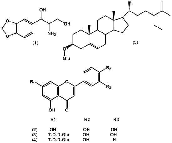 Accordingly, methylene chloride and ethyl acetate fractions were subjected to normal silica column chromatography, which afforded five compounds (Figure 3). The compounds were identified depending on NMR data as 1,3-propanediol-2-amino-1-(3′,4′-methylenedioxyphenyl) (1) [], luteolin (2) [], luteolin 7-O-β-D-glucoside (3) [], apigenin 7-O-β-D-glucoside (4) [], and β-sitosterol 3-O-β-D-glucoside (5). Compound (5) was characterized upon comparison with an authentic standard sample. For more details of structure elucidation, see the Supporting Information. Luteolin (2) and luteolin 7-O-β-D glucoside (3) were previously reported to be isolated from lettuce [], however, up to our knowledge, this is the first time apigenin 7-O-β-D glucoside (4) has been reported from L. sativa seed cake. It is worth mentioning that compound (1) is the first time to be isolated from Lactuca species, the second time from the Asteraceae family [], and the third time from nature [].