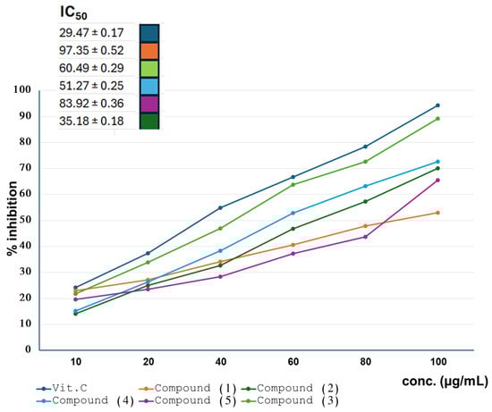 The isolated compounds were evaluated for their antioxidant, antimicrobial, and cytotoxicity. Compounds (3) and (4) showed strong antioxidant activity of IC50 35.18 ± 0.18 and 51.27 ± 0.25, respectively. Meanwhile, compound (2) showed moderate activity with an IC50 60.49 ± 0.29. In contrast, compounds (1) and (5) showed relatively weaker antioxidant activity compared to the ascorbic acid standard (Figure 4). In addition, compounds (2) and (3) exhibited promising antimicrobial activity throughout the tested compounds, with the highest percent activity index against S. aureus (71.7, 61.9), followed by P. aeruginosa (56.6, 51.5), C. albicans (40.5, 36.7), and E. coli (37.8, 33.8), respectively (Table 1). In addition, compounds (4) and (5) also possess antimicrobial activity but with a much lower percentage, especially against S. aureus, with percent activity 50 and 49.6, respectively. On the other hand, compound (1) showed weak anti-microbial activity compared to ciprofloxacin and clotrimazole standards (Table 1). The potential antioxidant and antimicrobial activity of methylene chloride and ethyl acetate fractions could be attributed to the content of compounds (2) and (3) in these active fractions. There are previous studies that reported both the antioxidant and antimicrobial activities of luteolin and its glucoside [,,]. Accordingly, they are the major compounds responsible for the antioxidant and antimicrobial capacity of L. sativa seed cake.