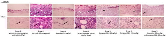 Histopathological analysis revealed that skin sections from Group 1 (negative control group) showed normal epidermis and dermis, including hair follicles, sebaceous glands, and collagen bundles, with no signs of inflammation. Microscopic images at higher magnification (Figure 5) displayed very few leukocytes in the dermis. In contrast, Group 2 (carrageenan group) exhibited severe dermal inflammation and significant leukocyte infiltration (thin black arrow). Treatment with lettuce seed cake extract in Group 4 led to a slight reduction in dermal inflammation. An oral dose of compound (1) at 20 mg/kg resulted in a moderate decrease in both inflammation and leukocyte infiltration, while Group 6, treated with compound (1) at 40 mg/kg, showed a substantial reduction in dermal inflammation. Group 3 (standard treatment) showed mild dermal inflammation, whereas the combination of compound (1) with standard ibuprofen (Group 7) demonstrated a synergistic effect, with no signs of inflammation and very few leukocytes (Figure 5).