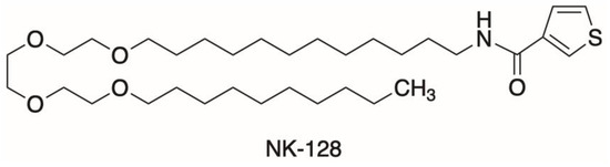 NK-128, characterized by a thiophene carboxamide with a long alkyl chain that includes a triethylene glycol moiety, is a structurally simplified analog of JCI-20679. The design of JCI-20679 is based on annonaceous acetogenins, a type of polyketide isolated from Annona plants (Figure 1) [7]. JCI-20679 exhibits potent antitumor activity against human lung cancer NCI-H23 cells [8,9] and glioblastoma [10,11]. Additionally, NK-128 exerts antitumor activity against glioblastoma and human colon cancer SW48 cells, despite being synthesized in only five steps from commercially available compounds (the synthesis of JCI-20679 requires 23 steps). Furthermore, NK-128 activates AMP-activated protein kinase (AMPK) by inhibiting OXPHOS in cancer cells.
