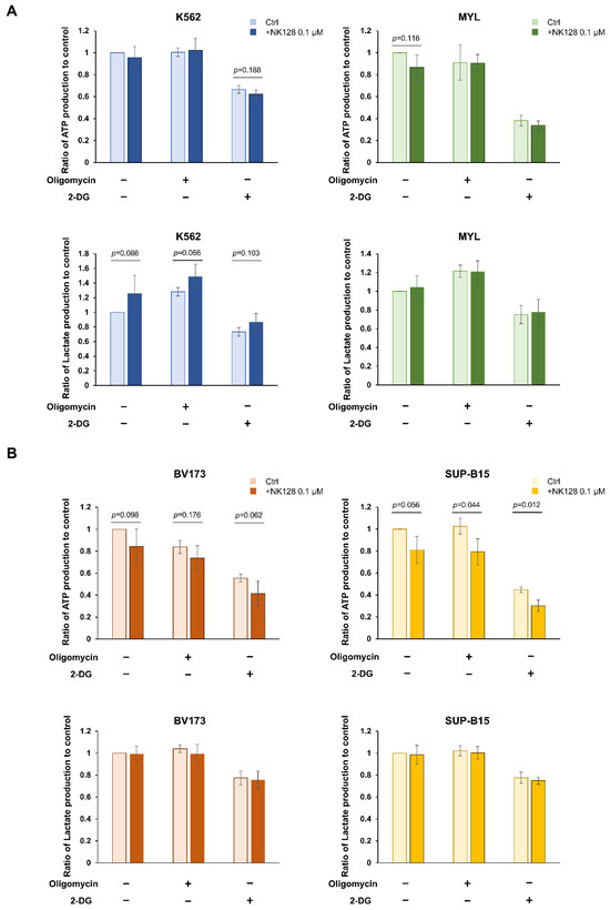 ATP and lactate production by K562, BV173, MYL, and SUP-B15 cells. Oligomycin inhibits OXPHOS, and 2-DG inhibits glycolysis. ATP and lactate production levels were determined in K562 and MYL cell lines, which are less sensitive to NK-128 (A) or in the sensitive cell lines, BV173 and SUP-B15 (B), as described in the Section 4. The main metabolic pathways of K562 and MYL are glycolysis-dependent. Conversely, those of BV173 and SUP-B15 are OXPHOS-dependent. NK-128 inhibits the production of ATP in BV173 and SUP-B15 cells, which are mainly OXPHOS dependent.