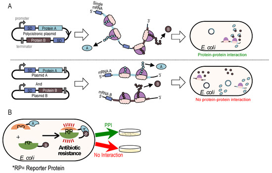 In these systems, a single plasmid expresses both proteins of interest from a single promoter with two constitutive Shine–Dalgarno sequences (SD, a bacterial ribosome binding site) that precede the open reading frames (ORFs) (Figure 1A). This configuration is expected to increase the likelihood of protein complex formation compared to systems where the two proteins are expressed from separate vectors and mRNAs. This is due to the spatial proximity of nascent polypeptides emerging from the same ribosome (Figure 1A).