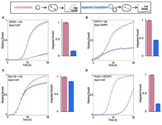 Detection of weak PPIs in proximal co-translation versus separated translation systems. We employed co-translation systems to study weak protein–protein interactions. In all plots, pink represents co-translation systems, and blue represents separated translation systems. (A) N-CAT-ENTH and C-CAT-Ub selective growth in 10 μg/mL chloramphenicol media. (B) Same as in (A), but the split-CAT reporter was replaced with split-DHFR, and growth in minimal selective media was supplemented with 2.5 μg/mL trimethoprim. (C) Rpn10 and Ub fused with the split-CAT fragments, showing selective growth in 12 μg/mL chloramphenicol media (D) PLK4 and DCAF1 selective growth in 16 μg/mL chloramphenicol media using split-CAT. Quantification of the growth was calculated by the integration of the sigmoidal curves. The relative integral values are presented as bar charts.