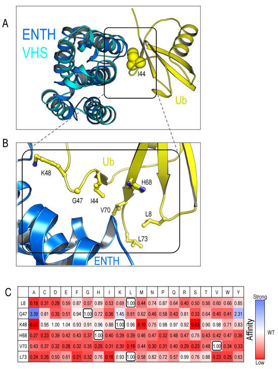 Homology-based structural model of ENTH:Ub. The complex structure of STAM1-VHS:Ub (PDB: 3LDZ) was superimposed on the structure of the yeast Ent1-ENTH domain (PDB: 5LOZ). (A) The alignment of the structures of VHS and ENTH suggests the binding patch of Ub on the ENTH surface. (B) Zoom-in view of the binding interface, showing the residues on the Ub-I44 patch. (C) Heatmap summarizing the relative growth efficiency of the indicated point mutants. The E. coli growth assay was performed on selective media with 10 μg/mL chloramphenicol. Growth efficiency compared to the WT Ub, measured by quantification of the spot’s growth over 24 h, integrating the sigmoidal growth curves. Red represents weaker binding, blue represents stronger binding, and the wild-type residues at each position are framed in black.