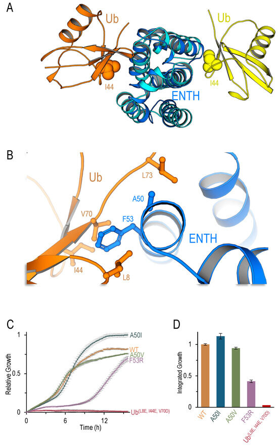 Recent advances in structural modeling and the development of AlphaFold2 that can model protein–protein complexes [40] led us to re-examine the modeling of the ENTH:Ub complex. Surprisingly, AlphaFold2 did not replicate the binding mode observed in the VHS:Ub complex presented above, but instead, it predicted models of a new Ub-binding patch located at the other side of the domain compared with that displayed by the homology-based model (Figure 4A). AlphaFold2’s model differs from the homology-based model, likely due to its ability to predict novel interactions based on deep learning rather than evolutionary conservation alone. We performed a careful structural assessment of the suggested models and chose to focus on the rank-1 model generated by AlphaFold2. This model presented the one with the highest predicted local distance difference test (pLDDT) score [41] adopted by AlphaFold to assess the model quality. The model predicted that ENTH residue F53 forms hydrophobic interactions with residues L8, I44, and V70 on Ub (Figure 4B). Moreover, the model also predicted that ENTH residue A50 is positioned near Ub L73 but at a distance of more than 4 Å. To test this prediction, we hypothesized that substituting A50 with a valine or an isoleucine (A50V or A50I), two hydrophobic residues that could potentially increase the interaction with Ub-L73, would increase affinity and enhance growth. Conversely, we predicted that mutation of the key interacting residue F53 to arginine (F53R) would significantly decrease the affinity.