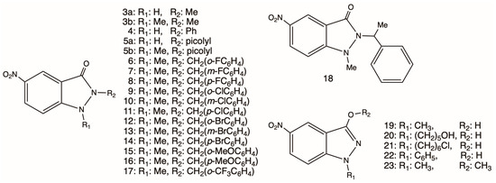 - Fonseca-Berzal, C.; Ibáñez-Escribano, A.; Reviriego, F.; Cumella, J.; Morales, P.; Jagerovic, N.; Nogal-Ruiz, J.J.; Escario, J.A.; da Silva, P.B.; Soeiro, M. de N.C.; et al. Antichagasic and Trichomonacidal Activity of 1-Substituted 2-Benzyl-5-Nitroindazolin-3-Ones and 3-Alkoxy-2-Benzyl-5-Nitro-2H-Indazoles. Eur. J. Med. Chem. 2016, 115, 295–310. [Google Scholar] [CrossRef]