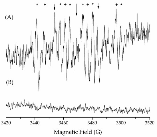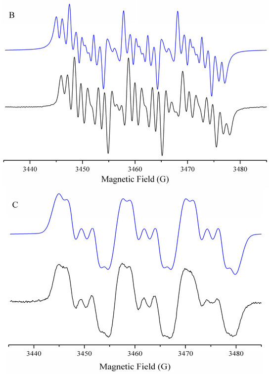 - Duling, D.R. Simulation of Multiple Isotropic Spin-Trap EPR Spectra. J. Magn. Reson. B 1994, 104, 105–110. [Google Scholar] [CrossRef]