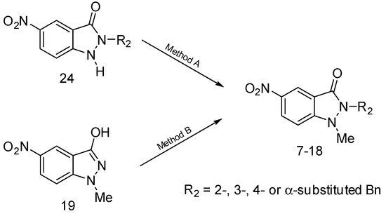 2.1. Synthesis of 1,2-Disubstituted 5-nitroindazolin-3-ones