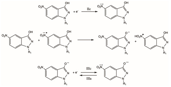 - Folch-Cano, C.; Olea-Azar, C.; Arán, V.J.; Diaz-Urrutia, C. ESR and Electrochemical Study of 1,2-Disubstituted 5-Nitroindazolin-3-Ones and 2-Substituted 3-Alkoxy-5-Nitro-2H-Indazoles: Reactivity and Free Radical Production Capacity in the Presence of Biological Systems. Spectrochim. Acta A Mol. Biomol. Spectrosc. 2010, 75, 375–380. [Google Scholar] [CrossRef] [PubMed]