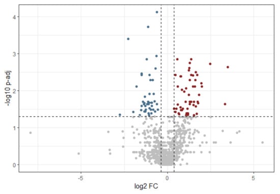 Volcano plot of differential abundance analysis results obtained by using DE analysis tool from HSP Wiki. Red = up-regulated proteins, blue = down-regulated proteins, gray = non-significant differentially abundant proteins (log2 (FC) higher than 1.3 or lower than −1.3, representing 30% variation; p-adj > 0.05).