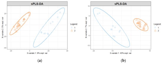 sPLS-DA analysis. Group: 1 = OSCC patients; 2 = healthy controls. (a) sPLS-DA performed on initial matrix. X axis = component 1 (it explains 9% of variance). Y axis = component 2 (it explains 5% of variance). (b) sPLS-DA performed on final matrix after RFE. X axis = component 1 (it explains 45% of variance). Y axis = component 2 (it explains 7% of variance).