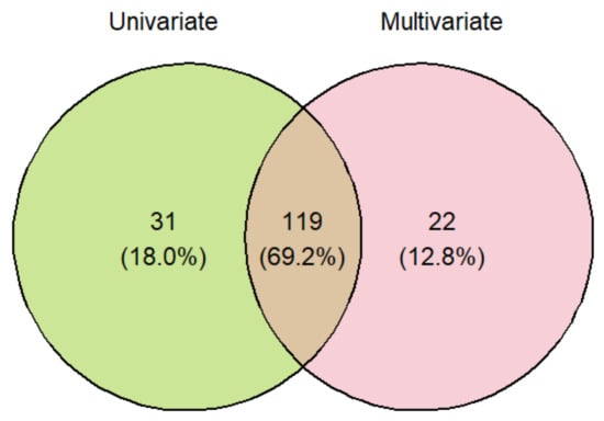 To retrieve more information, two different approaches were adopted to analyze the differential protein abundance: a univariate approach and a multivariate approach. Using the DE analysis tool from the HSP Wiki, the expression in the two groups (OSCC and healthy) was compared for each protein by computing the log2 mean fold changes and employing the Wilcoxon rank-sum test. The fold change value was computed as the ratio between the average abundance of the two groups (OSCC/healthy). The resulting p-values were corrected to the false discovery rate (FDR) according to the Benjamini–Hochberg procedure. Only proteins with an expression difference higher than ±30% (up-regulated or down-regulated) and with an adjusted p-value lower than 0.05 were selected.