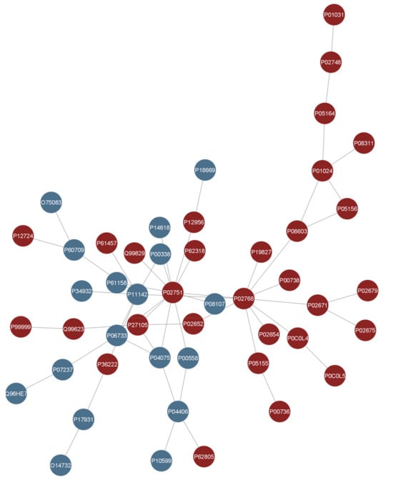 Among the proteoforms selected by the univariate and multivariate approaches, 119 were in common (Figure 3), including 38 isoforms. The combination of the two lists comprised 172 differentially abundant proteoforms. Out of them, 54 were isoforms. Thus, the 118 unique IDs (not considering isoforms) were used as input to query the IMEx database to generate a PPI network. After removing the first interactors, self-loops, and duplicated edges, the resulting PPI network was composed of 48 connected proteins (30 up-regulated, 18 down-regulated) (Figure 4 and Figure 5). These proteins are listed in Table 1. Thus, the PPI network shows proteins directly interacting together among the biomarkers list and were those selected for the further analysis.
