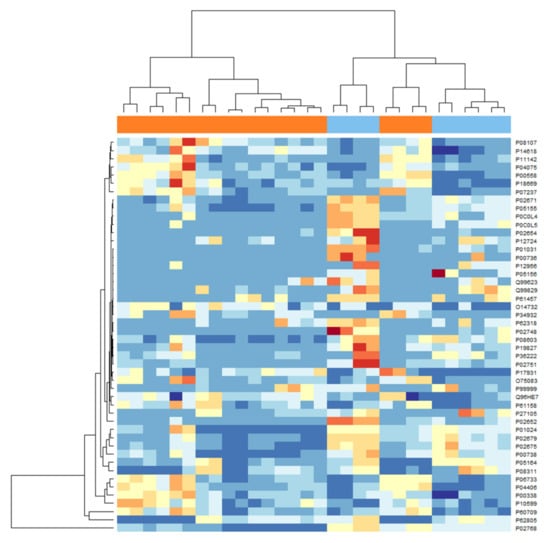 A heatmap of the differential abundance of the 48 connected proteins in the PPI network reported in Figure 4. Colors span from blue (down-regulated) to red (up-regulated). The bar on the top indicates the group: light blue = OSCC patients and orange = healthy controls.