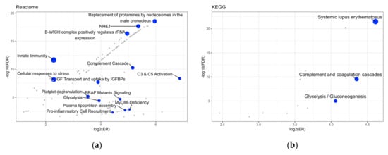 Volcano plots of the ORA results. The size of each dot is related to the number of proteins present in the overlap between the input data and the signature. Blue = pathways selected through affinity propagation. Gray = other enriched pathways. (a) Enriched pathways in the Reactome database. (b) Enriched pathways in the KEGG database.