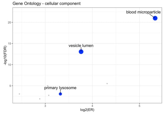 To investigate the functional roles of the mapped proteins within known pathways, we performed an over-representation analysis interrogating KEGG and Reactome as pathway databases, using the 48 proteins listed in Table 1 as the input list. KEGG analysis revealed 12 enriched categories (three after redundancy reduction), while Reactome revealed 156 enriched categories (16 after redundancy reduction). Both analyses showed enrichment in pathways related to immune processes (innate immunity, neutrophil degranulation, complement, and coagulation) among those with a lower FDR (Figure 6). GO cellular component analysis revealed eight enriched categories (three after redundancy reduction), with significant enrichment of proteins localized in the extracellular region (Figure 7). These results showed additional significantly enriched pathways with respect to the ORA performed on the 119 proteoforms resulting from the intersection of the univariate and multivariate analyses (Figure S4).