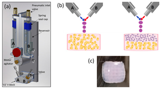 (a) A schematic CAD model showing the arrangement of a bio-ink reservoir and microvalves within a ReJI printhead. Tubes directly link the reservoirs to the microvalves so that reservoirs A and B feed valves A and B respectively. (b) The microvalves produce droplet streams which collide and react to produce gel droplets which fall to the substrate to create monoculture gels (left, osteoblasts in gel) or, with sequential printing, co-culture gels (right, chondrocytes and osteoblasts or MSCs in laminar culture). (c) An example printed hydrogel viewed from above, 6 mm square, 3 mm thick. (b) created with BioRender.com.