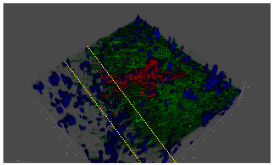A confocal image of the MSC–chondrocyte co-culture proof-of-concept study showing a laminar structure. An imaged interface between a printed layer of Y201 MSC cells and TC28a2 chondrocyte cells after 3 days of co-culture in F12/DMEM media. Blue: cell nuclei; red: aggrecan; and green: collagen II. Dashed yellow lines identify the laminar interface, which is a few cells thick, through the change in collagen II expression as we move from Y201 cells to TC28a2s. Tick marks on the scale are 10 µm apart.