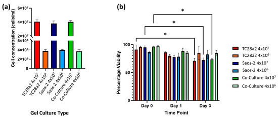 (a) The cell concentration (cells per mL) of cells in digested hydrogels immediately after printing (n = 3). (b) The post-print viability of cell-filled 3D-printed hydrogels, containing TC28a2, Saos-2, and TC28a2/Saos-2 co-cultures (n = 2). There is no significant difference between the viability of the different cell types in any of the printed densities at any of the timepoints. When p ≤ 0.05 is represented by *, and p > 0.05 is not significant and not represented on the graph.