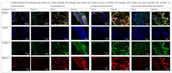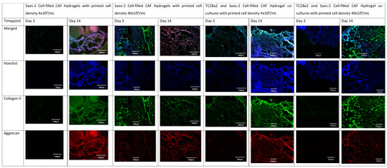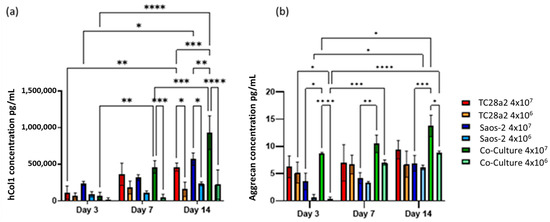 Overall, we observe that as the cell density increases, so does the rate of ECM production, indicating that printing with the highest cell density is the quickest way to create biomimetic tissue models with these cell types. We also observed that the formation of an ECM in co-cultures is greater than that found in the single cell cultures, particularly evident for hCol1 in Figure 6a, but reinforced by Figure 4 and Figure 5. It is also clear for these cell types that growth in a co-culture has a large impact on aggrecan production as we obtain the surprising result that the aggrecan detected in the high density co-culture samples is significantly higher than the corresponding high density monoculture samples at day 14, even though the co-cultures have half the number of chondrocytes and half the number of osteoblasts of the equivalent cell density monocultures. This together with the observations on hCol1 suggests that both the TC28a2 chondrocytes and the Saos-2 osteoblasts are being stimulated to produce more ECM by the presence of the other cell type.