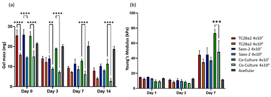 All the gel cultures lost mass over the 14-day culture period, Figure 7, with the high-cell-density gels starting out heavier and remaining heavier throughout the culture period. We consider that there are four competing mechanisms at play in determining the mass changes in the gels. The first is cell migration from the gels, the second is cell proliferation, the third is gels being digested by the cells [45], and the fourth is ECM production by the cells. Acellular gels exhibited no significant loss of mass over the entire two-week period, so gel dissolution in the absence of cells is not a factor. The digestion of the gels is related to cell migration through the gels (cells enzymatically degrade their surrounding matrix in order to create space to move into), so counter-intuitively, this can be initially higher in low-cell-density gels, where there is less competition for space and as a result more migration. The increase in the compression modulus between day 3 and day 7 for all the gels can only be explained through proliferation and ECM production. The fact that there was no increase between day 1 and day 3 suggests that proliferation and/or ECM production does not pick up significantly until day 3 or that gel digestion is concentrated in the first few days of culture. The fact that the co-culture shows a significantly larger modulus increase between day 3 and day 7 when compared to the single cell cultures is considered to further reinforce the IHC and ELISA results in terms of the co-culture demonstrating increased levels of protein production. The compressive modulus of the gels in absolute terms is below that reported for articular cartridge (240−1000 kPa [46]), and so future work could consider a revised gel formulation and printing onto harder substrates (as shown by Kotlarz et al. [34]) to create a more biomimetic bone–cartilage interface.