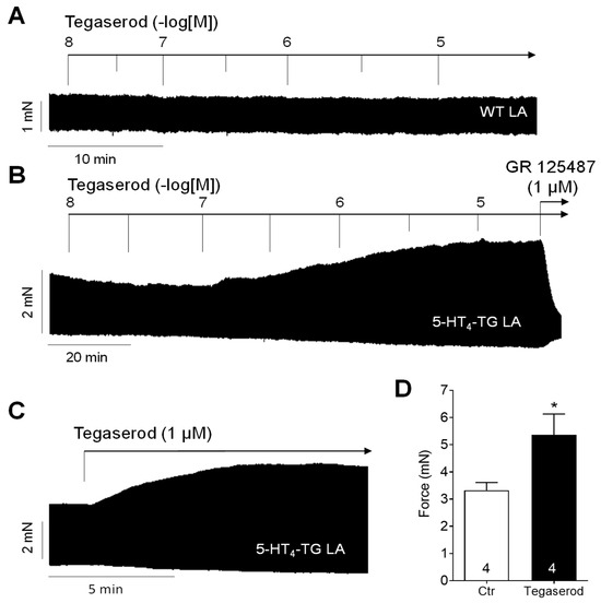 Tegaserod exerted a concentration- and time-dependent positive inotropic effect in left atrial preparations from 5-HT4-TG (Figure 2B). In contrast, tegaserod was ineffective in raising the force of contraction in left atrial preparations from WT (Figure 2A). Furthermore, the application of GR 125487, a 5-HT4 receptor antagonist, completely reversed the positive inotropic effect of tegaserod in 5-HT4-TG (Figure 2B). The results are consistent with our previous findings. 5-HT is unable to elevate force of contraction in atrial preparations from WT (see, for example, [20]). Figure 2C shows the typical original recording for the effect of a single application of 1 µM tegaserod in 5-HT4-TG and in Figure 2D, several of these experiments are summarized. Force of contraction was increased by 59% from 3.33 ± 0.28 mN to 5.36 ± 0.77 mN (n = 4), but this effect was not statistically significant (non-parametric Wilcoxon test) due to the low number of experiments. For comparison, the force of contraction of the spontaneously beating right atrial preparations was also evaluated, but because of the negative force–frequency relationship in mouse atria, no positive inotropic effect of tegaserod was noted.