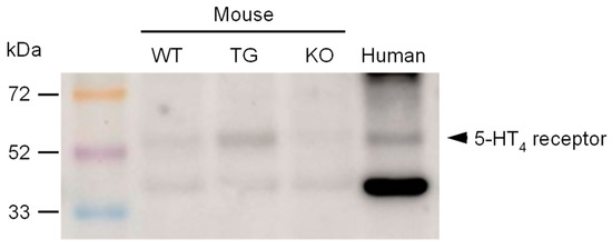 A representative Western blot for the 5-HT4 receptor antibody is shown herewith. The molecular weight markers (rainbow marker) are indicated in kilodaltons (kDa). The following samples were loaded: ventricular homogenates of a wild-type mouse (WT), a 5-HT4-TG mouse (TG), a 5-HT4 knock-out mouse (KO), and a homogenate of a human right atrial sample (human).