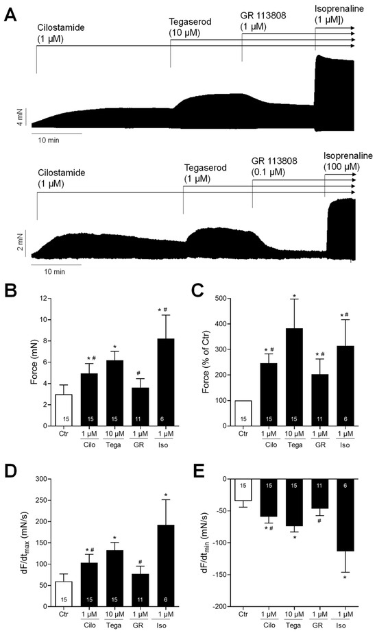 (A) Original recordings of the concentration- and time-dependent positive inotropic effect of tegaserod in millinewtons (mN) after cilostamide in human right atrial preparations. The horizontal bars indicate the time axis in minutes (min). First, 1 µM cilostamide was added followed by tegaserod; then, the 5-HT4 receptor antagonist GR 113808 (GR) was added. Finally, at the end of the experiment, isoprenaline (Iso) was added to the organ bath to test for efficiencies. (B–E) The summarized effects (means ± SEM) of 10 µM tegaserod (Tega) in the presence of cilostamide (Cilo; 1 µM) on the force of contraction in millinewtons (mN) (B) or in percentage of the pre-drug value (Ctr) (C) and on the rate of tension development (dF/dtmax) (D) and rate of relaxation (dF/dtmin) (E) in millinewtons per second (mN/s) are presented. Additionally, the effects of 1 µM GR and 1 µM Iso are shown. * p < 0.05 vs. Ctr (pre-drug value); # p < 0.05 vs. 10 µM tegaserod (mixed-effects analysis with Bonferroni’s multiple comparisons test). The numbers in bars indicate the number of experiments.