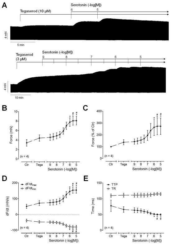(A) Original recordings of the concentration- and time-dependent positive inotropic effect of a single concentration of tegaserod before cumulatively applied serotonin in millinewtons (mN) in human right atrial preparations. Horizontal bars indicate time axis in minutes (min). (B–E) The summarized effects (means ± SEM) of cumulatively applied serotonin in presence of 10 µM tegaserod (Tega) on the force of contraction in millinewtons (mN) (B) or in percentage of the pre-drug value (Ctr) (C) and on the rate of tension development (dF/dtmax) and rate of relaxation (dF/dtmin) in millinewtons per second (mN/s) (D) and on the time to peak tension (TTP) and time to relaxation (TR) in milliseconds (ms) (E) are presented. * p < 0.05 vs. Ctr (pre-drug value); # p < 0.05 vs. 10 µM tegaserod (ANOVA: non-parametric Friedman test with Dunn’s multiple comparisons test). The numbers in parentheses indicate the number of experiments.