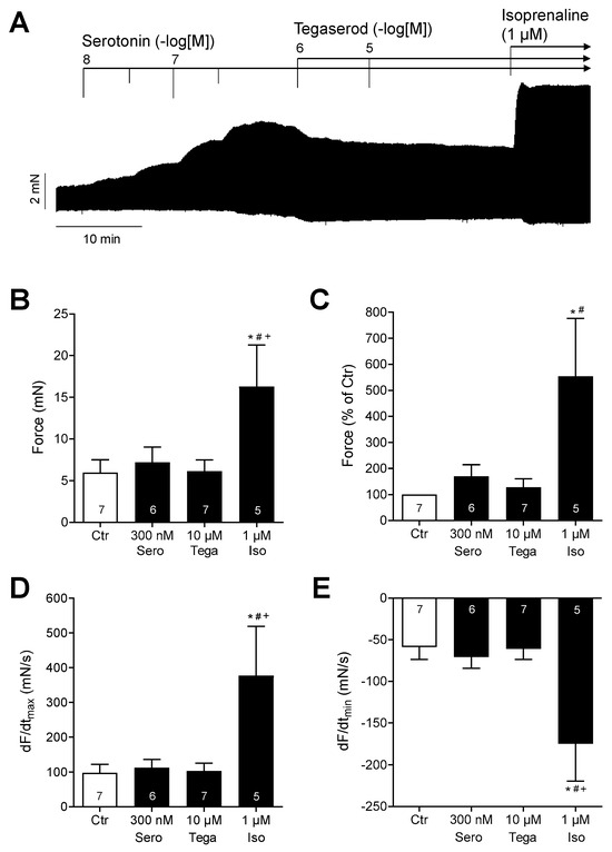 (A) Original recording of the concentration- and time-dependent positive inotropic effect of tegaserod (1 µM and 10 µM) after cumulatively applied serotonin (up to 300 nM) in millinewtons (mN) in a human right atrial preparation. Horizontal bar indicates time axis in minutes (min). At the end of the experiment, 1 µM isoprenaline (Iso) was added to the organ bath to test for efficiencies. (B–E) The summarized effects (means ± SEM) of 10 µM tegaserod (Tega) in the presence of serotonin (Sero; 300 nM) on the force of contraction in millinewtons (mN) (B) or in percentage of the pre-drug value (Ctr) (C) and on the rate of tension development (dF/dtmax) (D) and rate of relaxation (dF/dtmin) (E) in millinewtons per second (mN/s) are presented. Additionally, the effect of finally applied Iso (1 µM) is shown. * p < 0.05 vs. Ctr (pre-drug value); # p < 0.05 vs. 10 µM tegaserod; + p < 0.05 vs. 300 nM serotonin (mixed-effects analysis with Bonferroni’s multiple comparisons test). The numbers in bars indicate the number of experiments.