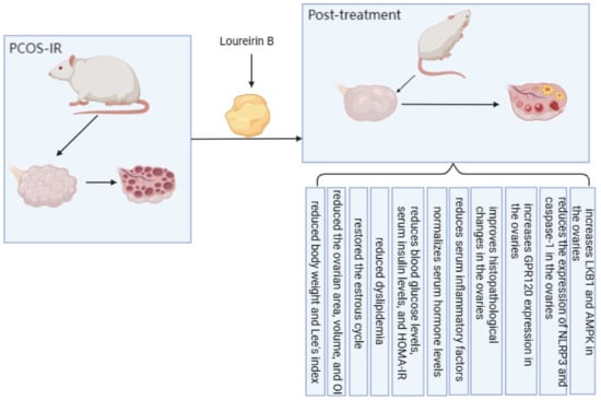 Wang J, Huang Z, Cao Z, Luo Y, Liu Y, Cao H, Tang X, Fang G. Loureirin B Reduces Insulin Resistance and Chronic Inflammation in a Rat Model of Polycystic Ovary Syndrome by Upregulating GPR120 and Activating the LKB1/AMPK Signaling Pathway. International Journal of Molecular Sciences. 2024; 25(20):11146. https://doi.org/10.3390/ijms252011146