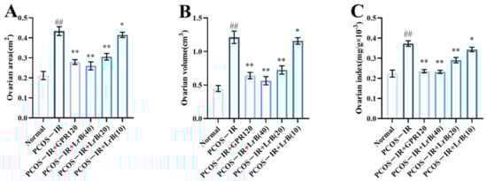 2.2. LrB Reduced the Ovarian Area, Volume, and OI in PCOS-IR Rats
