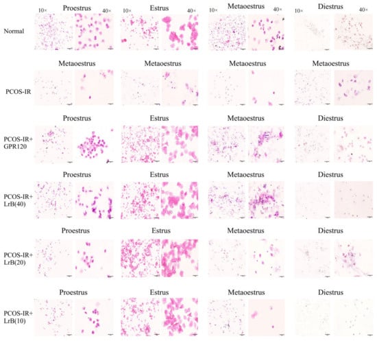 2.3. LrB Treatment Restored the Estrous Cycle in PCOS-IR Rats
