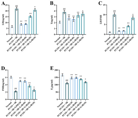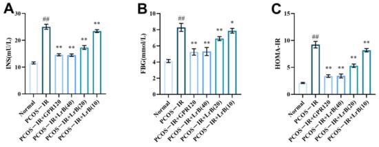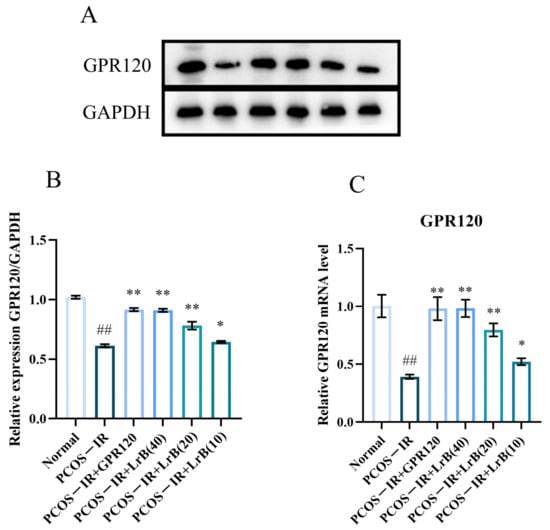 APA StyleWang, J., Huang, Z., Cao, Z., Luo, Y., Liu, Y., Cao, H., Tang, X., & Fang, G. (2024). Loureirin B Reduces Insulin Resistance and Chronic Inflammation in a Rat Model of Polycystic Ovary Syndrome by Upregulating GPR120 and Activating the LKB1/AMPK Signaling Pathway. International Journal of Molecular Sciences, 25(20), 11146. https://doi.org/10.3390/ijms252011146