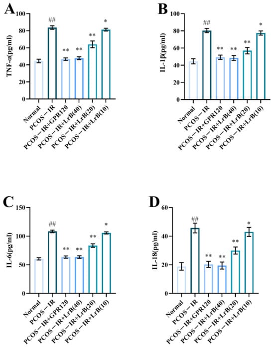 2.7. LrB Treatment Reduces Serum TNF-α, IL-1β, -6, and -18 in PCOS-IR Rats