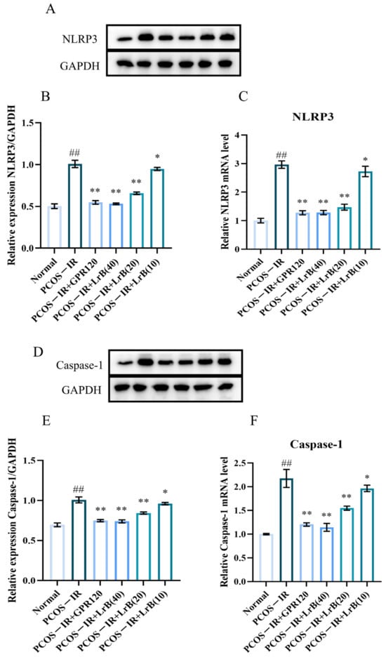 2.10. LrB Reduces the Expression of NLRP3 and Caspase-1 in the Ovaries of PCOS-IR Rats