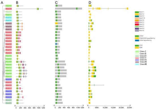 Comprehensive analysis of PbDof genes in Phoebe bournei. (A) The phylogenetic trees developed to elucidate the relationships among PbDof members, highlighting evolutionary patterns and potential functional similarities or divergences. (B) Conserved motifs in PbDofs, illustrating their distribution and prevalence across different proteins. (C) Analysis of the conserved domains within PbDofs, emphasizing the structural elements essential for their transcription factor activity and interaction with other proteins. (D) Gene structures of the PbDof genes, representing the exon-intron organization of the PbDof genes, with particular focus on variations among different subfamilies.