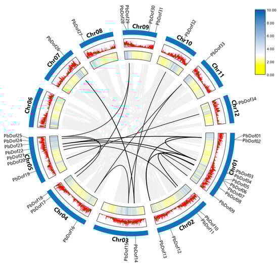 A circular presentation of the genomic map of Phoebe bournei. The outer segments of the circle represent the 12 assembled chromosomes. Each segment is labeled from chromosome 1 (Chr01) through chromosome 12 (Chr12). Moving inward from the outermost part of each chromosomal segment, the first circle indicates the nucleotide positions in megabases (Mb), providing a scale for genetic mapping. Adjacent to this, the gene density is visualized, with peaks indicating areas of higher gene concentration. The gray line in the innermost circle represents all replications in the P. bournei genome gene pairs, the black line indicates the PbDofs collinear gene pair.