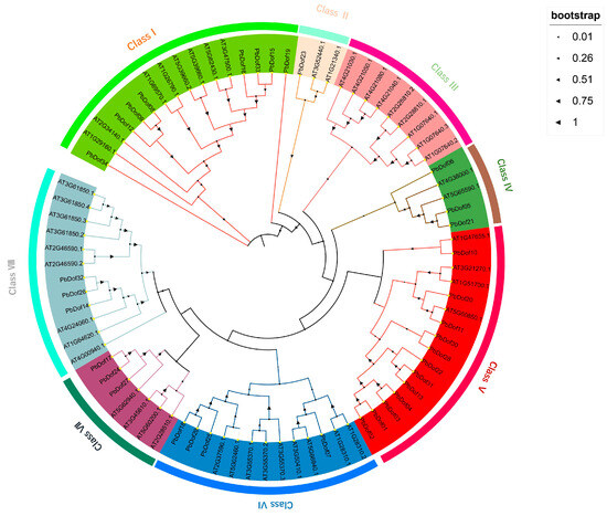 To classify the PbDof family and emphasize the differences between P. bournei and other plants, 34 hypothetical PbDofs and 47 reference AtDofs (Plant TFDB) were selected to construct the phylogenetic tree (Figure 4). According to the previous classifying of A. thaliana [3], the phylogenetic tree was divided into eight subclasses: class I contained eight PbDofs and eight AtDofs; class II included three members, comprising one PbDof and two AtDofs; class III consisted of nine Dof proteins from A. thaliana, with no corresponding counterparts in P. bournei. Class IV, with five members, included three PbDofs and four AtDofs. Class V consisted of 12 PbDofs and 4 AtDofs, while Class VI had 4 PbDofs and 9 AtDofs. In Class VII, there were three PbDofs and four AtDofs, and the final subclass, Class VIII, contained three PbDofs and nine AtDofs. Among the eight classes, Class V had the highest number of members (12 Nos), whereas Class II had the fewest (1 Nos). Moreover, the results showed that the homology among PbDofs was generally higher than the homology between PbDofs and AtDofs.