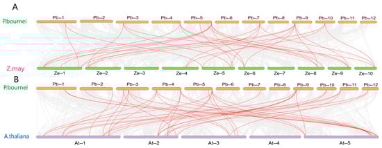 (A) The collinearity analysis between Dof genes of P. bournei and A. thaliana. (B) The Dof genes collinearity analysis between P. bournei and Z.mays. Different species names and chromosomes are represented by different colors. The red line indicates the homologous Dof gene pairs between other species and PbDofs, the grey line indicates all homologous gene pairs on the chromosome and the number in parentheses after the species name indicates the number of collinearity pairs between the Dof gene of the species and PbDof genes.
