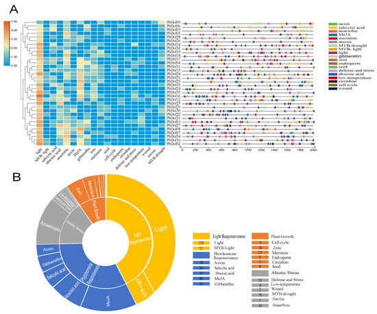 Predicted cis-element on the promoter of the PbDof genes. (A) The abridged general view of distribution of cis-element positions in each PbDof. (B) The pie chart shows the number of cis-acting elements in PbDofs. Different colors indicate different core cis-acting elements in response.