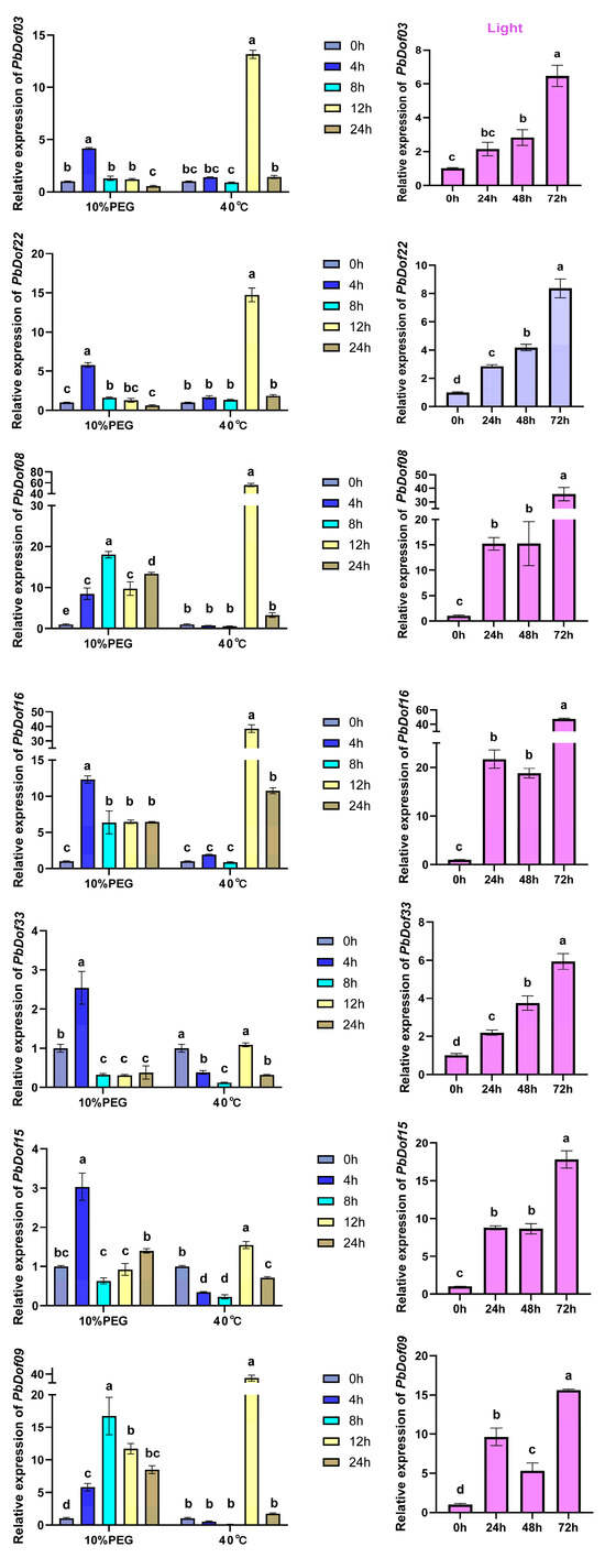 Real-time quantitative PCR (RT-qPCR) expression levels of selected PbDof genes under drought (10%PEG) heat (40 °C) and light (3000 lx) treatment. PbDof gene expression levels were analyzed by RT-qPCR. The sample size of the experiment is 3. The purple color represent light treatment, and the other colors represent the treating time. Significant differences (p < 0.05) determined by the LSD test, expressed by different letters above the bar.