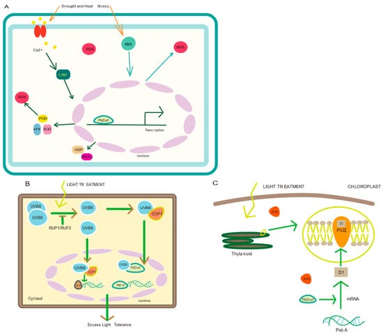 When plants are exposed to abiotic stress, the levels of ROS [56], Ca2+ concentration and ABA in plant cells increase within plant cells. ABA is a key factor in regulating the plant response to abiotic stress. At present, only a few studies have shown that Dof gene regulates abiotic stress response through ABA-dependent signaling pathway to reduce intracellular ROS concentrations. However, the precise mechanisms underlying this process remains poorly understood. There is also an ABA-independent pathway that contributes to the plant’s response to abiotic stress. Under drought and heat stress, Dof gene expression promotes the production of genes encoding heat shock proteins (HSFs), peroxidases and DNAJ proteins, which work together to maintain ROS homeostasis in cells and participate in osmotic protection (Figure 10A) [57]. Plants possess two systems-photoreceptors and chloroplasts-that receive light information from the environment. Both systems have mechanisms to respond to excess light exposure. The UVB8 receptor receives UV-B light from excess light. A single UVB8 molecule can directly bind to transcription factors to regulate the light stress response [58]. After plants were subjected to light treatment, photosystemII (PSII) on the thylakoid membrane of chloroplasts becomes highly susceptible to photoinhibition [59]. The UVB8 molecule may bind to HY5 and PbDofs, respectively, and thus jointly regulate light stress (Figure 10B). In addition, excess ROS accumulates within the chloroplast matrix. The core subunit protein (D1 protein) of the photosystem II complex in the thylakoid membrane is particularly sensitive to ROS and is easily degraded by oxidative damage. At the same time, ROS also inhibits the translation of psb A, the gene encoding D1 protein [60]. The primary repair mechanism in plant chloroplasts for PSII following light stress involve ROS scavenging and the D1 repair cycle. ROS in the chloroplast matrix is degraded by ROS scavenging enzymes [61]. It is speculated that the Dof transcription factor was involved in regulating the expression efficiency of the psb A gene under light stress (Figure 10C).