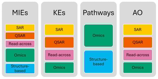 Recently, omics technologies have given birth to a new branch of toxicology known as toxicogenomics [121], which, by integrating omics data analysis and computational toxicology, investigates toxicity pathways and cellular responses to exposure to chemical substances [9,122,123]. Within the AOP framework, this integration facilitates the identification of downstream effects of MIEs and supports KEs by detecting molecular changes [5,9,14,116]. Most importantly, toxicogenomics provides highly valuable mechanistic information and is crucial in constructing AOPs by offering information on KEs, pathway enrichment, and biomarkers for toxicity testing [14,124].