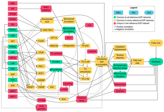 Drug-induced steatosis has the potential to directly cause metabolic-associated steatotic liver disease (MASLD, formerly known as non-alcoholic fatty liver disease). Even though drugs are not typically a primary cause of MASLD, it has been demonstrated that they might underlie, mimic, or exacerbate MASLD [23]. It is known that certain drugs commonly used in clinical practice, such as amiodarone, tamoxifen, or certain chemotherapeutic agents, may contribute to hepatic steatosis. Drug-induced steatosis is a well-studied condition, and the mechanisms behind it have been extensively described in various AOPs. These AOPs have been combined into a comprehensive AOP network, which is depicted in Figure 2 [11,24,25,26].