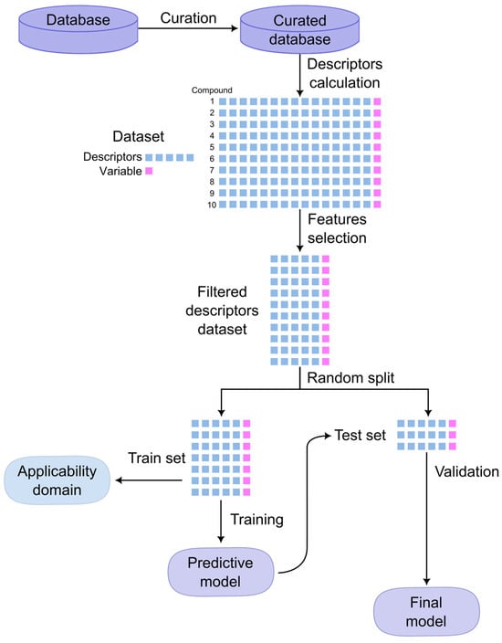 The process of constructing a QSAR model follows a systematic workflow comprising several key steps, as illustrated in Figure 4: data gathering and curation to ensure that the available information (chemical structures and property of study) is suitable for modelling; the calculation of molecular descriptors; feature selection to identify the most relevant descriptors; model training using ML algorithms; validation to ensure its predictive performance and reliability; and determination of the model’s AD [47,68]. The quality of a QSAR model depends on factors such as the quality of input data, choice of descriptors, and statistical methods for modelling and validation [69].
