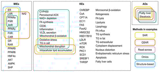 QSAR models can predict biological activities, enabling them to predict MIEs, KEs, and AOs. Several studies have addressed the QSAR modelling of different nuclear receptors that are identified as MIEs for steatosis [78,79,80,81]. Additionally, in 2018, Gadaleta and colleagues developed a set of nine QSAR models for in vitro high-throughput screening assays related to MIEs in the AOPs leading to liver steatosis: up- and downregulation of PXR, AHR, and LXR, as well as upregulation of PPARα, PPARγ, and NRF2 (nuclear factor (erythroid-derived 2) like 2) [25]. They used data provided by the ToxCast program [82] and employed strategies to address the issue of unbalanced datasets.
